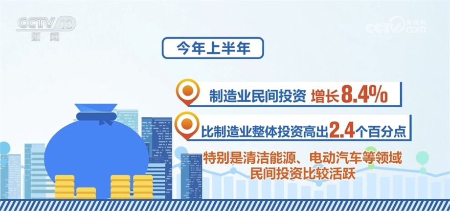 國家發(fā)展改革委相關(guān)負責(zé)人表示,當前,民間投資結(jié)構(gòu)持續(xù)優(yōu)化,一些領(lǐng)域民間投資顯現(xiàn)了不少亮點。今年上半年,除房地產(chǎn)開發(fā)以外的民間投資同比增長9.4%,增速比全部投資高5.6個百分點;制造業(yè)民間投資增長8.4%,比制造業(yè)整體投資高出2.4個百分點,特別是清潔能源、電動汽車等領(lǐng)域民間投資比較活躍;基礎(chǔ)設(shè)施民間投資增長15.6%,比基礎(chǔ)設(shè)施整體投資高出8.4個百分點,呈現(xiàn)出較強的投資信心和投資動力。