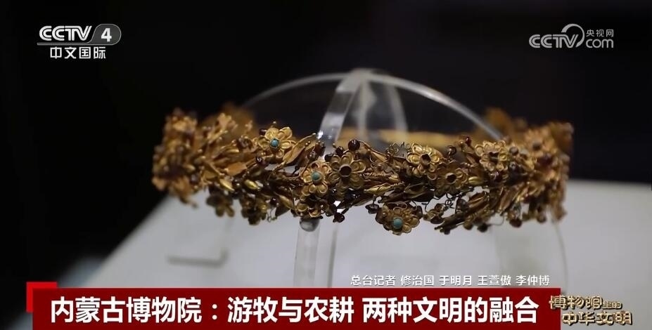 總臺(tái)記者 于明月:這里是位于呼和浩特市的內(nèi)蒙古博物院。從外觀上就能看出,這座建筑的設(shè)計(jì)靈感就來自于草原。它整體造型的寓意是美麗遼闊的草原上矗立著刻滿年輪的氈包,旁邊蜿蜒的小路象征著草原從幽深的遠(yuǎn)古走來,又向美好的未來走去。兩側(cè)舒展的飄蓬代表著草原上圣潔的哈達(dá),迎接八方來客。這座博物院里面收藏有古生物化石、歷史文物、民族民俗文物15萬(wàn)余件,在眾多文物之中如果要說出一件鎮(zhèn)館之寶,大家一定會(huì)想到“鷹頂金冠飾”。