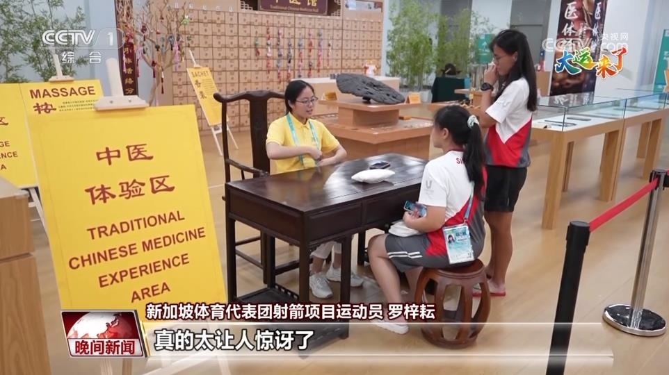 走在大運(yùn)村里面,在很多地方都可以看到一些中醫(yī)文化的元素。比如在這個(gè)中醫(yī)體驗(yàn)區(qū)里就可以了解中醫(yī)古籍,還能感受按摩,甚至能夠在這里進(jìn)行把脈問(wèn)診,所以這個(gè)區(qū)域也吸引了很多代表團(tuán)成員和運(yùn)動(dòng)員到這里來(lái)體驗(yàn)。