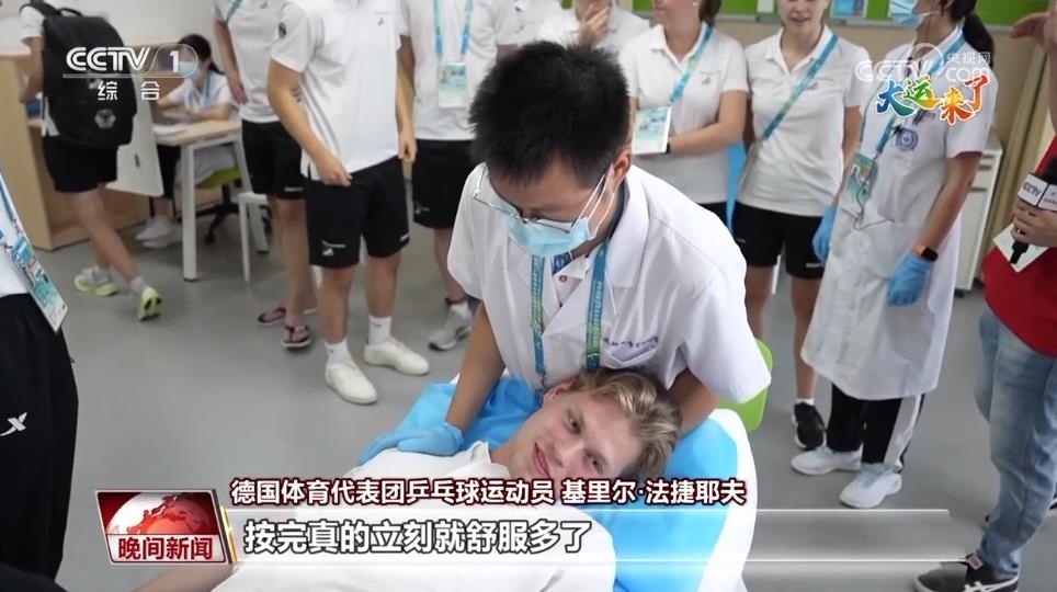 德國(guó)體育代表團(tuán)乒乓球運(yùn)動(dòng)員 尼爾斯·霍邁爾:不敢想象在大運(yùn)村還有這么好的醫(yī)療服務(wù),之前完全沒(méi)想到。在德國(guó)也有一些診所提供類(lèi)似服務(wù),但能在這里感受一手的中醫(yī)康復(fù)服務(wù),真的太酷了。