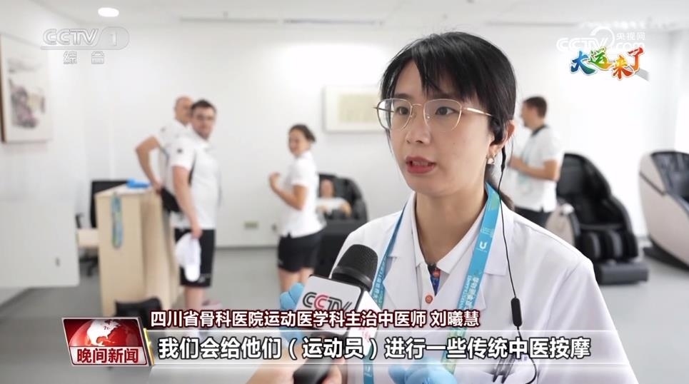 四川省骨科醫(yī)院運(yùn)動(dòng)醫(yī)學(xué)科主治中醫(yī)師 劉曦慧:我們會(huì)給他們(運(yùn)動(dòng)員)進(jìn)行一些傳統(tǒng)中醫(yī)按摩,還有一些特殊的穴位和特殊的治療方法。除此之外,我們還有一些傳統(tǒng)的針灸拔罐,針對(duì)性地對(duì)他們進(jìn)行一些治療和預(yù)防。