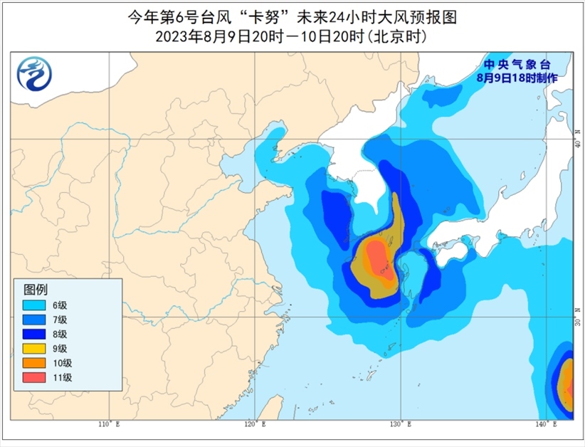 9日20時(shí)至10日20時(shí),渤海東部、渤海海峽、黃海大部海域、東海東部海域?qū)⒂?-7級(jí)、陣風(fēng)8-9級(jí)的大風(fēng),其中黃海中部和南部偏東海域、東海東北部偏東海域風(fēng)力可達(dá)8-9級(jí),“卡努”中心經(jīng)過的附近海域風(fēng)力可達(dá)10-11級(jí)、陣風(fēng)12-13級(jí);遼東半島沿岸也將有5-6級(jí)大風(fēng),陣風(fēng)可達(dá)7-8級(jí)。