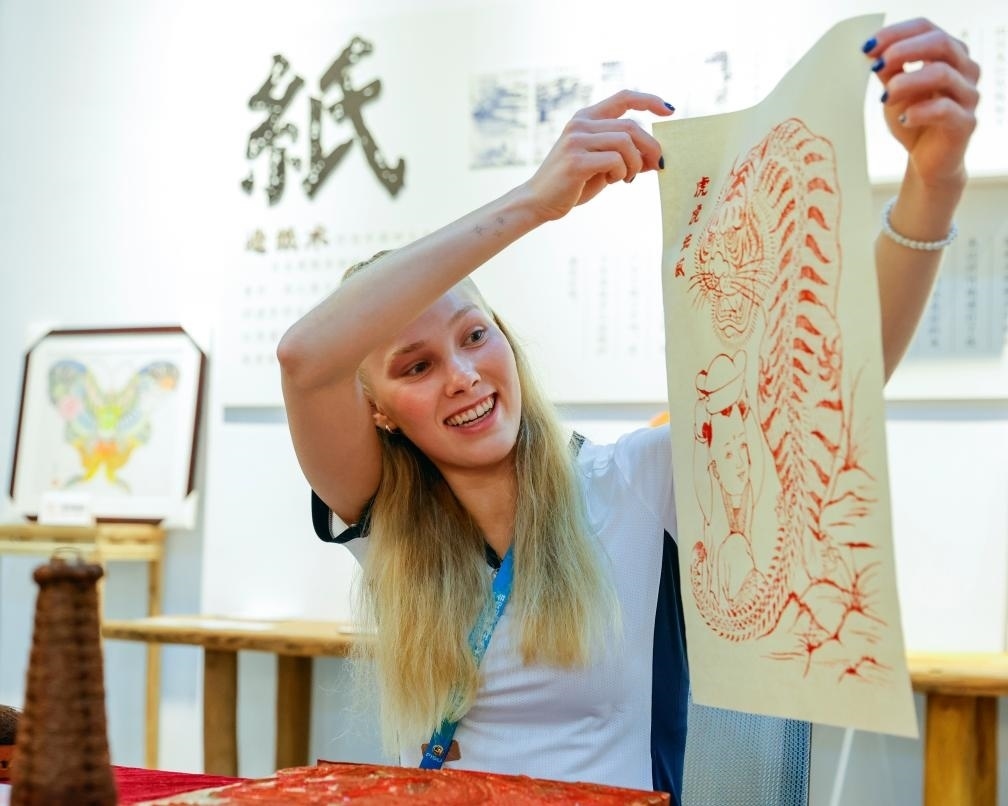 8月3日,在成都大運(yùn)村的互動(dòng)體驗(yàn)中心,芬蘭運(yùn)動(dòng)員杰茜卡·卡哈拉展示自己制作的夾江年畫(huà)。新華社記者 沈伯韓 攝