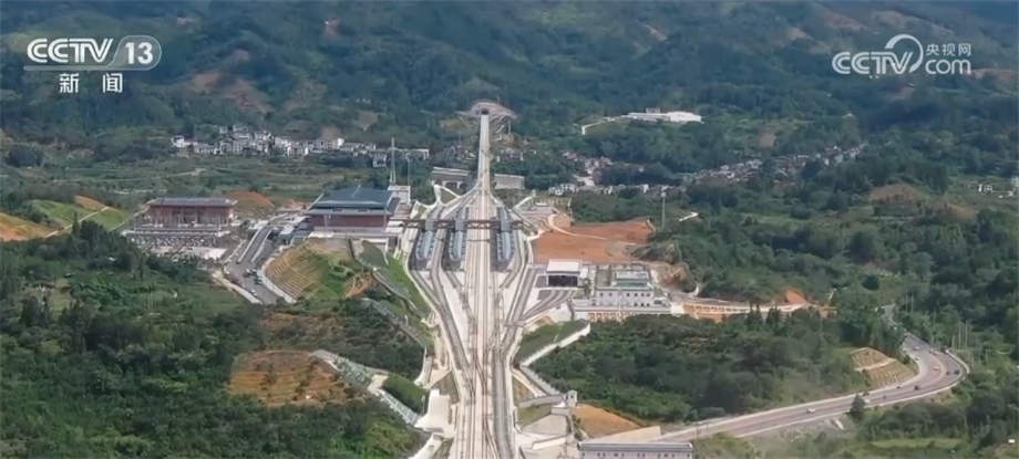 總臺記者 茍順庭:在我身后就是全長12.7公里的貴南高鐵朝陽隧道。因為隧道所在的山體存在有大量的巖溶地質(zhì)點,地下暗河、溶洞溶腔交錯縱橫、環(huán)境復(fù)雜,所以這個朝陽隧道是整條線路上風險系數(shù)最高的控制性工程。穿過朝陽隧道后,就到了貴南高鐵貴州段的最后一站——荔波站。