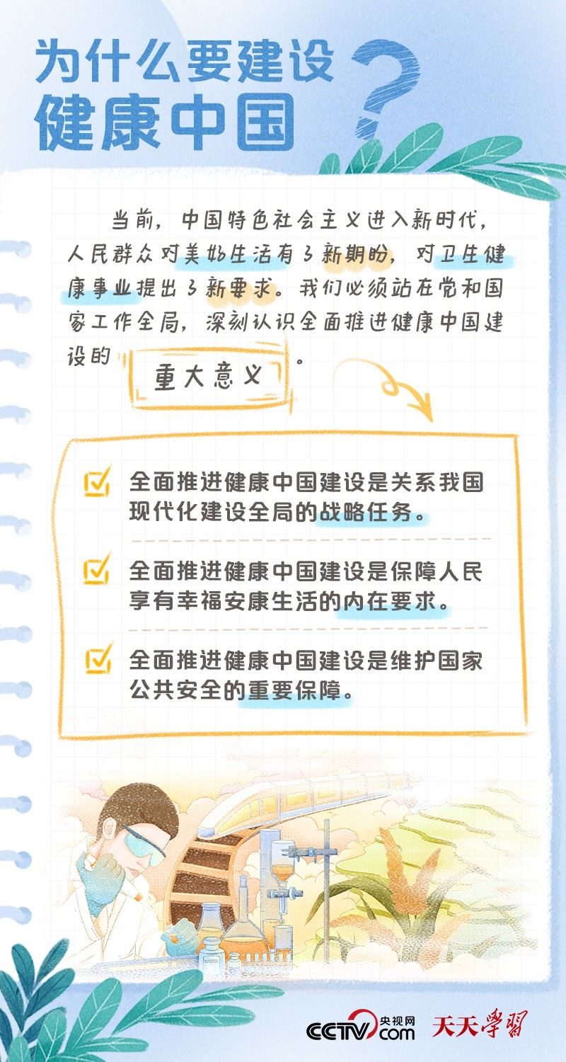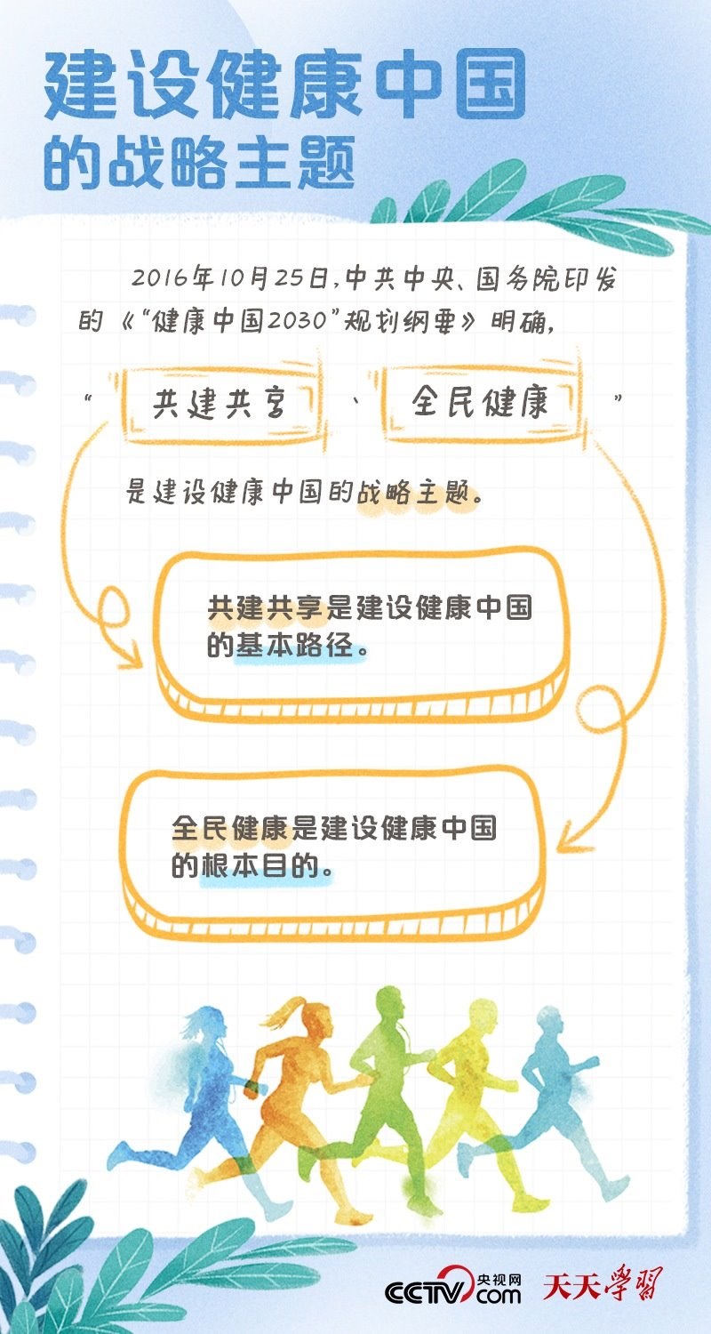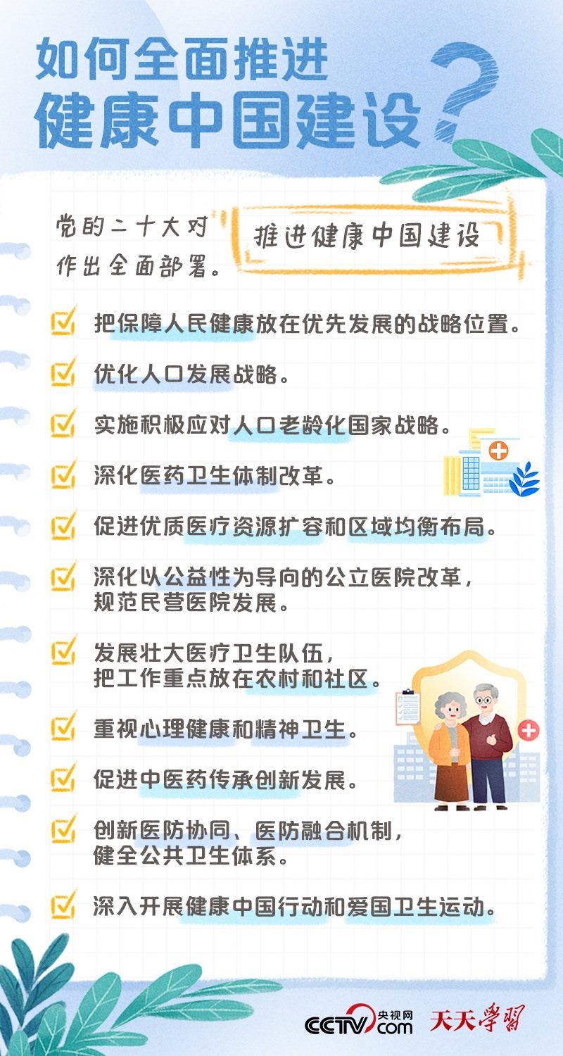 黨的二十大報告將“建成健康中國”作為到2035年我國發(fā)展的總體目標之一,并指出,人民健康是民族昌盛和國家強盛的重要標志,把保障人民健康放在優(yōu)先發(fā)展的戰(zhàn)略位置,完善人民健康促進政策。什么是健康中國?如何全面推進健康中國建設(shè)?央視網(wǎng)《天天學習·學習筆記》特梳理相關(guān)內(nèi)容,為您解讀總書記治國理政關(guān)鍵詞——健康中國。