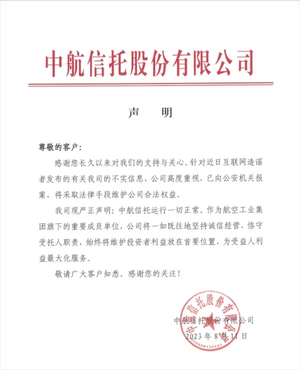 中航信托股份有限公司(下稱“中航信托”)在微信官方公眾號發(fā)文回應稱,“針對近日互聯(lián)網造謠者發(fā)布的有關我司的不實信息,公司高度重視,已向公安機關報案,將采取法律手段維護公司合法權益。我司現(xiàn)嚴正聲明:中航信托運行一切正常。作為航空工業(yè)集團旗下的重要成員單位,公司將一如既往地堅持誠信經營,恪守受托人職責,始終將維護投資者利益放在首要位置,為受益人利益最大化服務?!?/p>