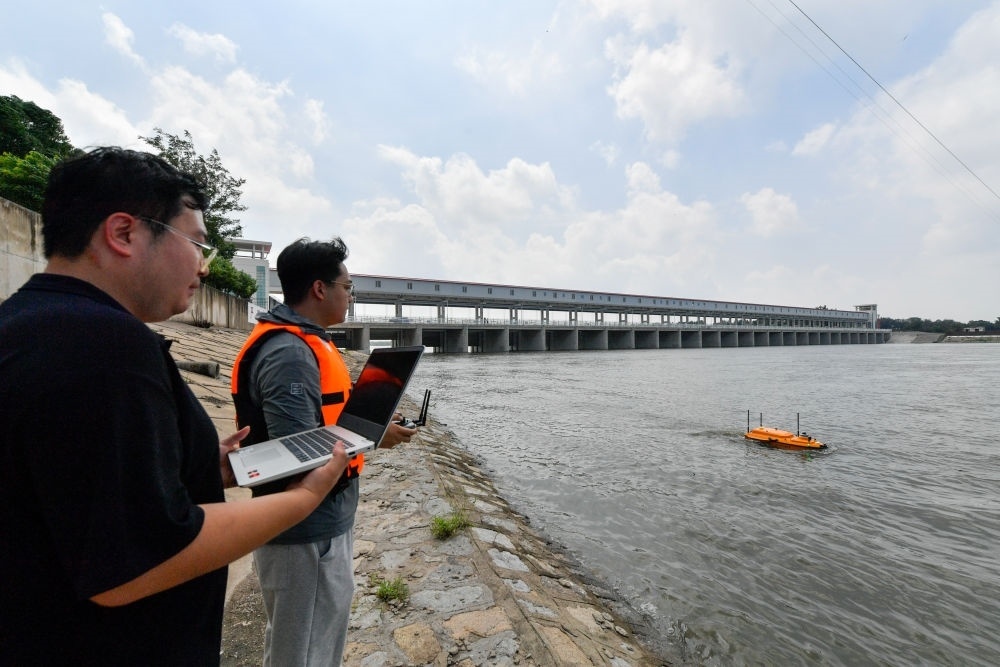 8月2日,在天津市獨流減河進洪閘上游,水文人員操作無人水文監(jiān)測船進行水文監(jiān)測。新華每日電訊記者孫凡越攝
