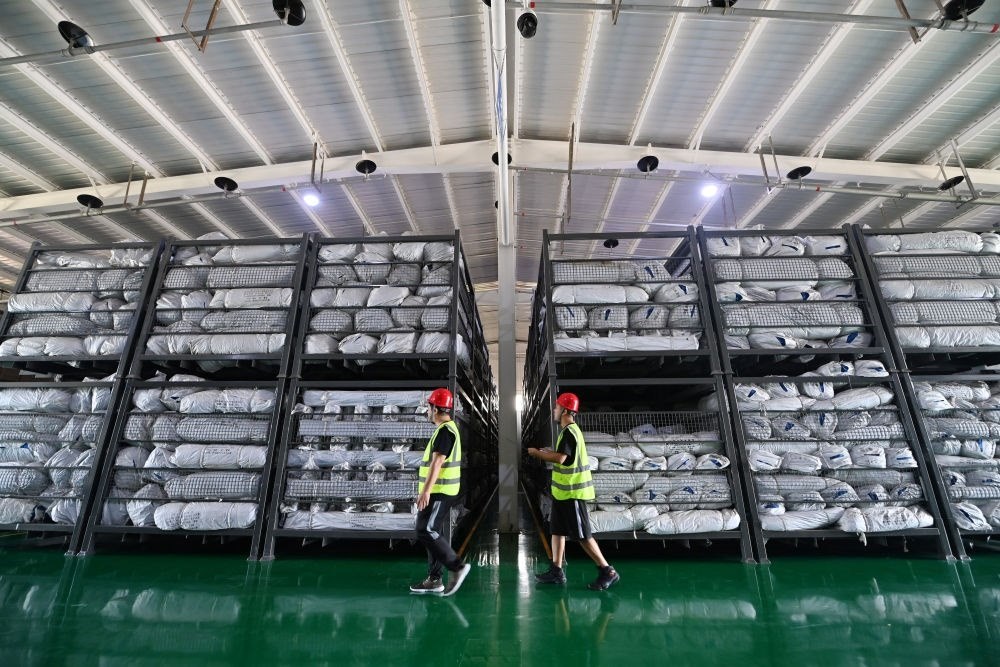 工作人員在天津市救災物資儲備站內(nèi)的倉庫巡查(8月16日攝)。新華每日電訊記者李然攝