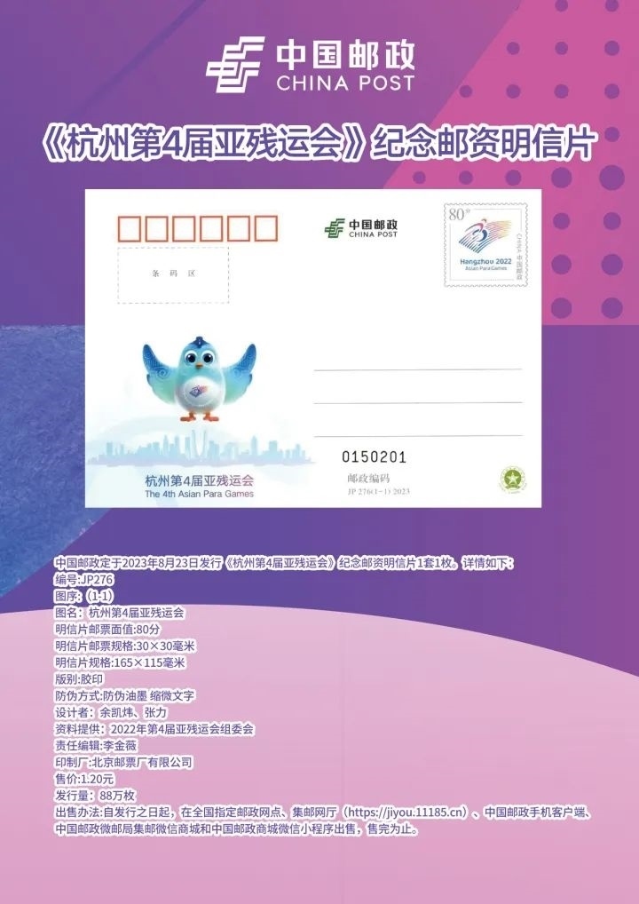 今天,中國郵政還發(fā)行了《杭州第4屆亞殘運會》紀念郵資明信片一套1枚,編號為JP276。郵資圖為杭州亞殘運會會徽,主體表現(xiàn)杭州亞殘運會名稱和吉祥物飛飛,襯以杭州城市剪影,體現(xiàn)“兩個亞運,同樣精彩”的辦賽理念,激勵殘疾人運動員在競技舞臺上,展現(xiàn)勇于挑戰(zhàn)、戰(zhàn)勝自我、創(chuàng)造幸福的良好精神風(fēng)貌。
