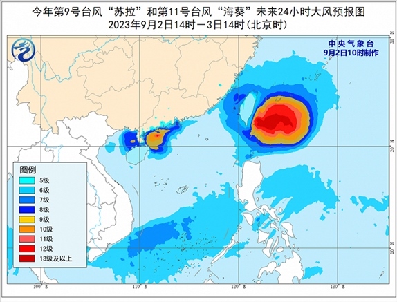 大風(fēng)預(yù)報(bào):9月2日14時(shí)至3日14時(shí),受“蘇拉”影響,南海西北部、北部灣東部、瓊州海峽及廣東中西部沿海、廣西南部沿海、海南北部沿海、珠江口以及香港和澳門等地將有6-8級(jí)、陣風(fēng)9-10級(jí)的大風(fēng),“蘇拉”中心經(jīng)過的附近海面或地區(qū)風(fēng)力有11-12級(jí)、陣風(fēng)13-14級(jí);受“??庇绊懀_(tái)灣海峽、巴士海峽、浙江南部沿海、福建沿海、廣東東部沿海、臺(tái)灣島沿海將有6-8級(jí),陣風(fēng)9-10級(jí)大風(fēng),臺(tái)灣以東洋面部分海域風(fēng)力可達(dá)9-12級(jí),陣風(fēng)13-14級(jí),“??敝行慕?jīng)過的附近海面風(fēng)力可達(dá)13-16級(jí),陣風(fēng)17級(jí)及以上。