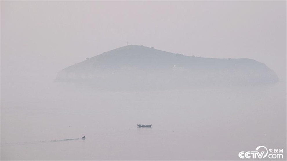 2023年9月3日清晨,大連,星海灣東部海域上空霧氣彌漫,島礁、漁船在霧中若隱若現(xiàn)。大連市氣象臺于當日03時57分發(fā)布了海上大霧橙色預(yù)警信號。