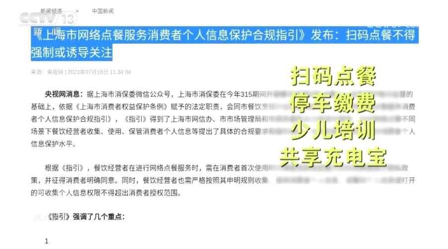 為了加強(qiáng)個人信息保護(hù),上海市消保委自7月起針對掃碼點餐、停車?yán)U費、少兒培訓(xùn)和共享充電寶等四種消費場景,分別出臺了合規(guī)指引、自律承諾和合規(guī)清單。未來,還將針對房產(chǎn)中介、商超購物等主要消費場景作出相應(yīng)指引。