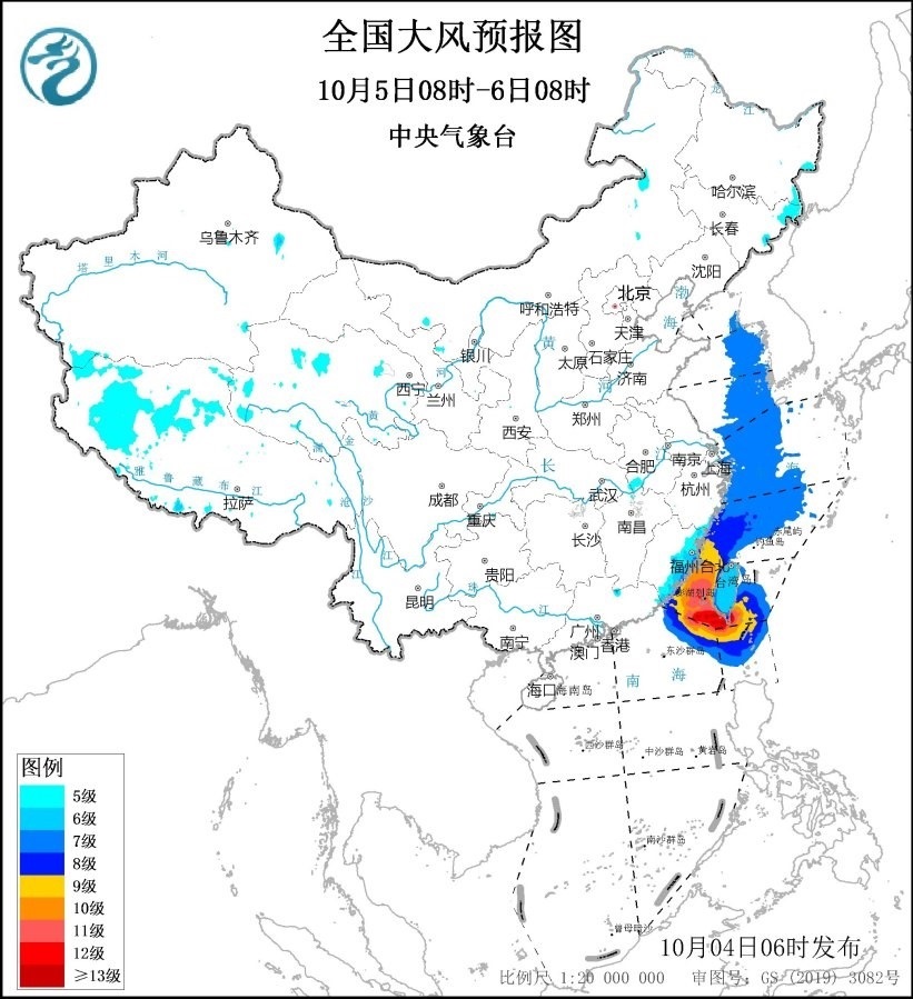 10月5日08時至6日08時,東海西南部海域、臺灣海峽、臺灣以東洋面、巴士海峽、南海東北部偏北海域將有8~9級、陣風10~11級的大風,其中臺灣海峽、臺灣以東洋面、巴士海峽的部分海域風力可達10~12級、陣風13~14級,臺風“小犬”中心經過的附近海域風力可達13~14級、陣風15~16級,黃海東部海域、東海西北部海域將有7級、陣風8級的大風;西藏西部將有5~6級、陣風7級的大風,浙江沿海、福建沿海、臺灣島將有6~8級、陣風9級的大風。