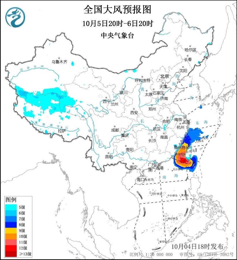 10月5日20時(shí)至6日20時(shí),東海西南部海域、臺灣海峽、臺灣以東洋面偏南海域、巴士海峽偏北海域、南海東北部偏北海域?qū)⒂?~8級、陣風(fēng)9~10級的大風(fēng),其中臺灣海峽、南海東北部的部分海域風(fēng)力可達(dá)9~10級、陣風(fēng)11~12級,臺風(fēng)“小犬”中心經(jīng)過的附近海域風(fēng)力可達(dá)11~12級、陣風(fēng)13級;西藏西部、浙江沿海、福建沿海、臺灣島將有5~6級、陣風(fēng)7級的大風(fēng)。