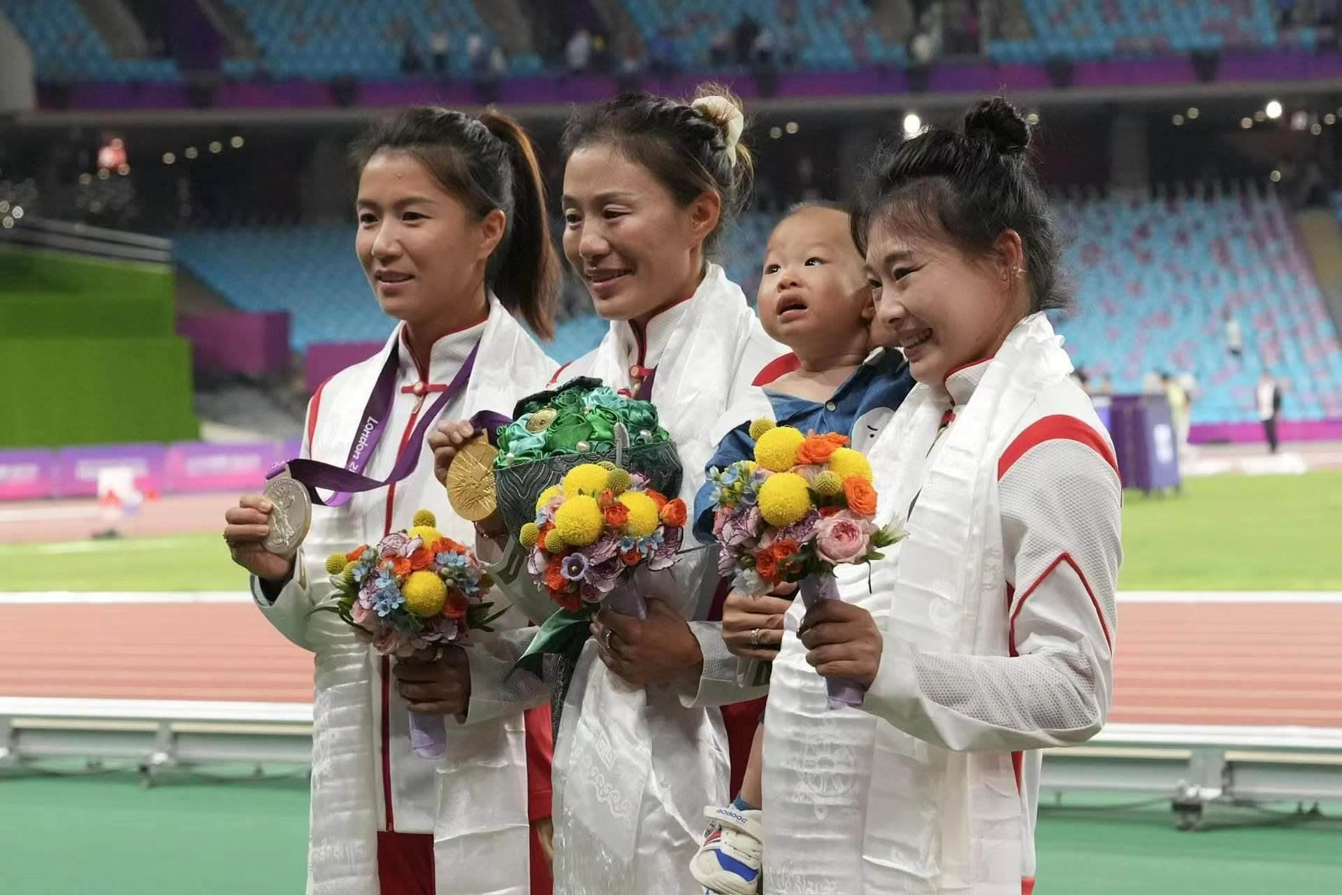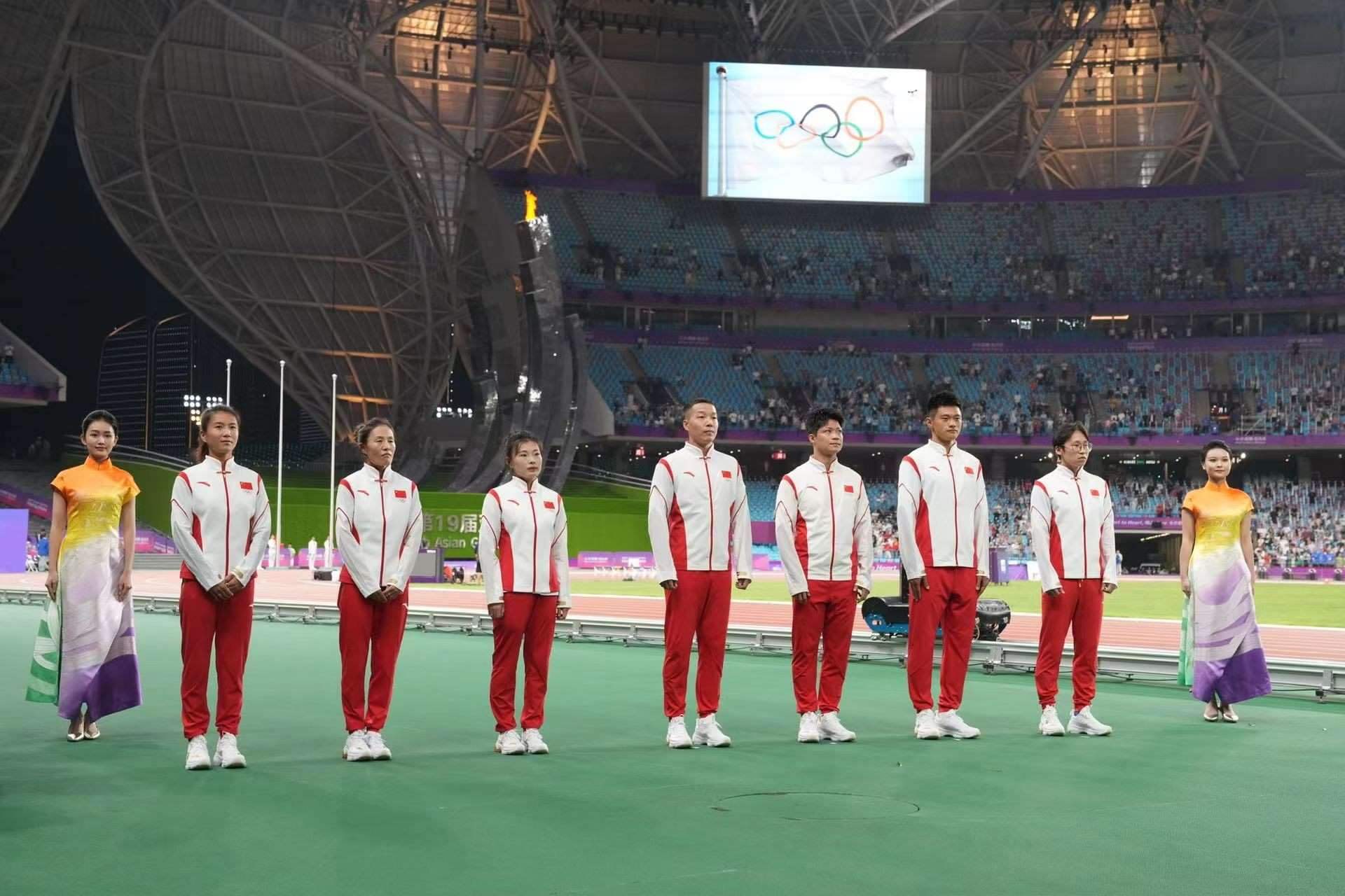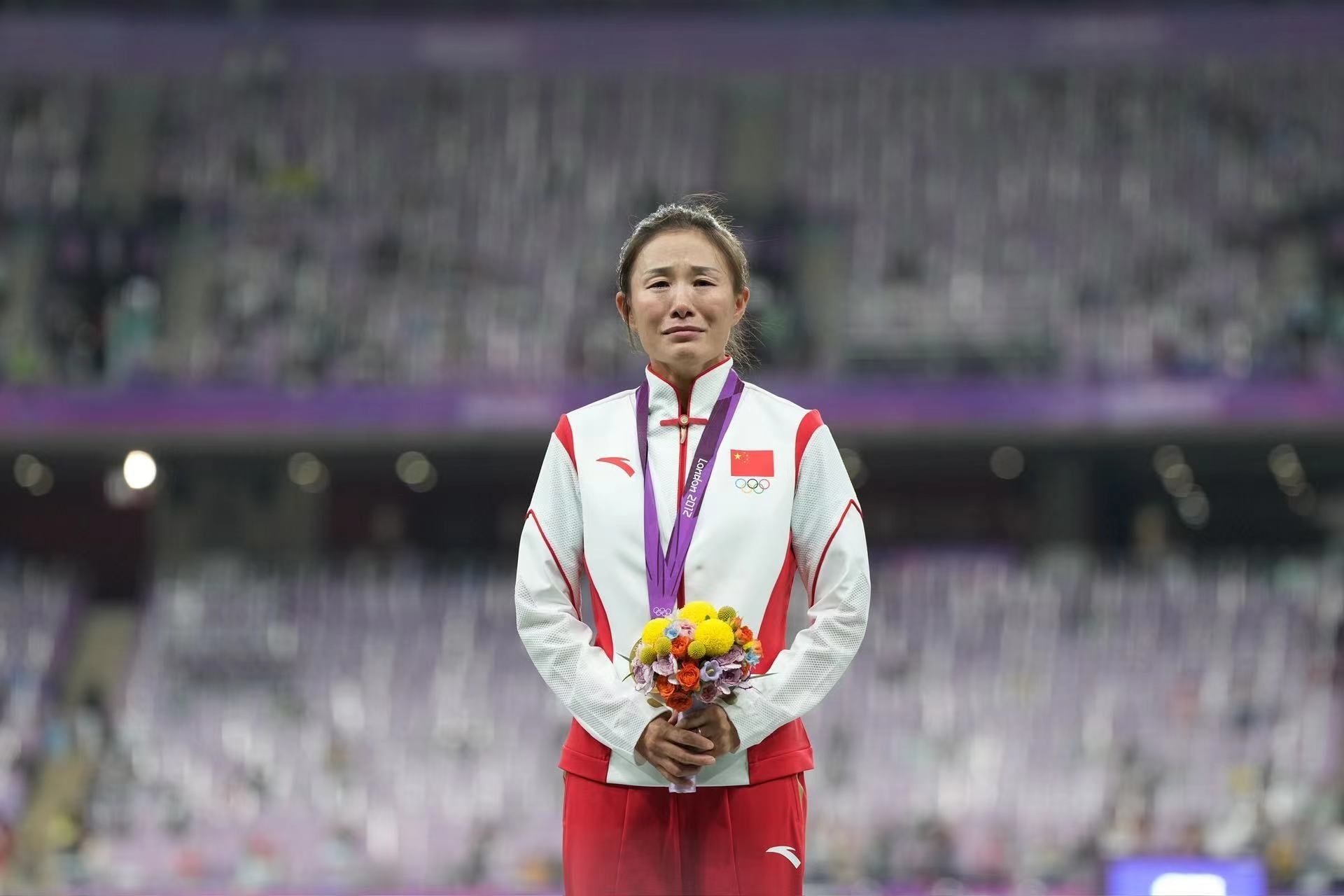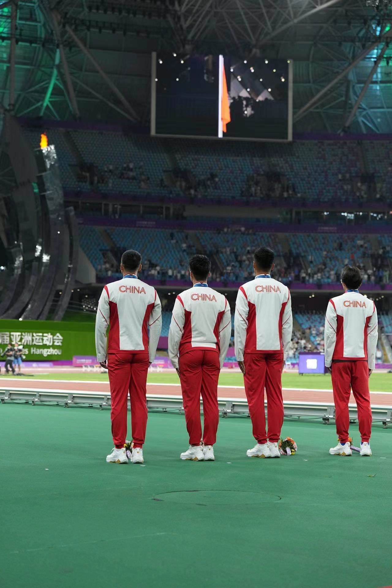 補發(fā)現(xiàn)場,首先頒發(fā)的是男子4×100米接力銅牌。四位中國小伙子笑著走上銅牌領(lǐng)獎臺,接受頒獎。隨后的競走頒獎儀式上,在三位得獎運動員獲頒獎牌后,《義勇軍進行曲》奏響,三面五星紅旗冉冉升起,切陽什姐眼中涌動著晶瑩的淚花。