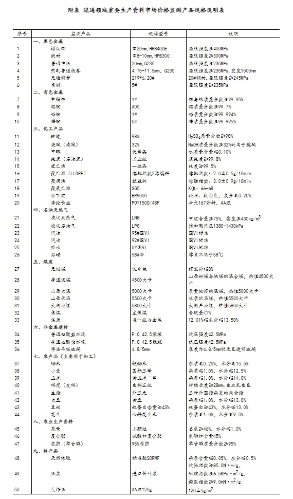 流通領(lǐng)域重要生產(chǎn)資料市場(chǎng)價(jià)格監(jiān)測(cè)內(nèi)容包括9大類50種產(chǎn)品的價(jià)格。類別與產(chǎn)品規(guī)格說(shuō)明詳見(jiàn)附表。