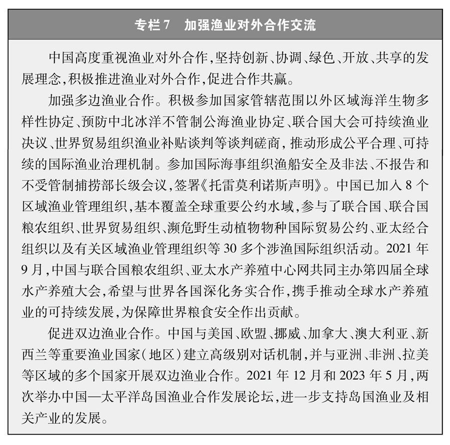 當(dāng)前,漁業(yè)資源的持續(xù)利用面臨氣候和環(huán)境變化等威脅,漁業(yè)資源的跨區(qū)域分布、流動性和洄游性也呈現(xiàn)出新的特點(diǎn),決定了漁業(yè)管理必須進(jìn)一步加強(qiáng)國際合作。中國深入踐行海洋命運(yùn)共同體理念,深化遠(yuǎn)洋漁業(yè)對外交流,多渠道、多形式開展互利共贏合作,不斷鞏固多雙邊政府間漁業(yè)合作機(jī)制,助力合作國家和地區(qū)漁業(yè)發(fā)展。