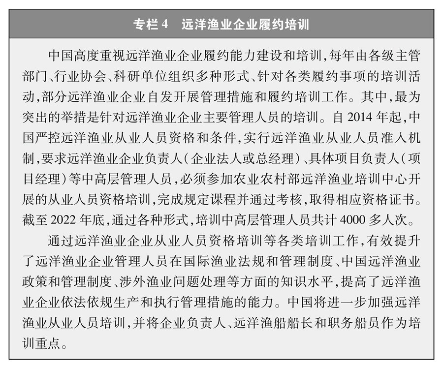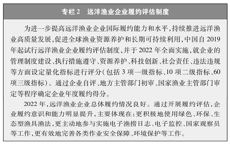 遠(yuǎn)洋漁業(yè)企業(yè)和漁船是履行國際公約、合法合規(guī)從事漁業(yè)生產(chǎn)的主體。2022年中國正式實(shí)施遠(yuǎn)洋漁業(yè)企業(yè)履約評估制度,將企業(yè)履約成績與行政審批、政策支持等掛鉤,通過正向激勵(lì)、反向倒逼的方式,引導(dǎo)企業(yè)不斷完善管理制度,嚴(yán)格執(zhí)行管理措施,避免發(fā)生違規(guī)行為,切實(shí)提高履約能力。這一制度有力促進(jìn)了遠(yuǎn)洋漁業(yè)企業(yè)規(guī)范管理和國際履約,得到了各方關(guān)注和廣泛認(rèn)可。
