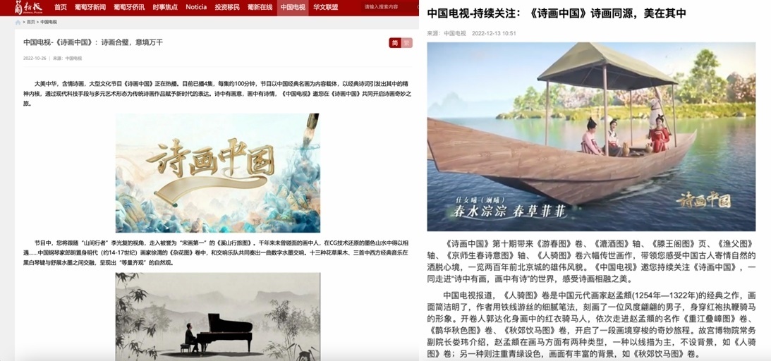 同時(shí),《詩(shī)畫(huà)中國(guó)》在傳播上也達(dá)到了節(jié)目?jī)?nèi)外的同頻共振,成功讓華夏文明輻射至全世界。在美國(guó)《國(guó)際日?qǐng)?bào)》網(wǎng)站和社交媒體賬號(hào)、法國(guó)《歐洲時(shí)報(bào)》網(wǎng)站和App、俄羅斯《龍報(bào)》網(wǎng)站和世界頭條App“北極熊視野”賬號(hào)等華文新媒體平臺(tái)上,節(jié)目相關(guān)內(nèi)容廣受歡迎。在2022“非洲伙伴”媒體合作論壇上,《詩(shī)畫(huà)中國(guó)》還作為總臺(tái)優(yōu)秀作品進(jìn)行了展示。日前于戛納影節(jié)宮舉辦的第六屆WISDOM in CHINA中國(guó)原創(chuàng)節(jié)目模式推介會(huì)上,節(jié)目更是以中國(guó)原創(chuàng)之名,登上了Mipcom主舞臺(tái)。