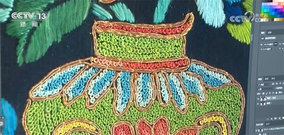 經(jīng)由高清設(shè)備采集、原樣分析、線圖提取,絲綢紋樣的圖案、色彩、針法、層級都在電腦屏幕上一覽無遺。