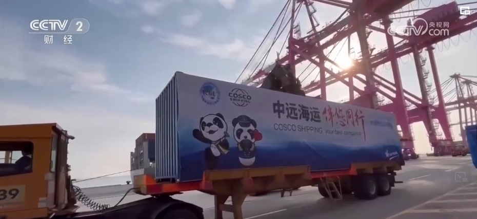 央視財(cái)經(jīng)記者 金荷淼:進(jìn)博會(huì)的吉祥物“進(jìn)寶”戴著的這條圍巾是黃藍(lán)相間的,黃色代表“絲綢之路經(jīng)濟(jì)帶”,藍(lán)色代表“21世紀(jì)海上絲綢之路”,這恰恰體現(xiàn)著進(jìn)博會(huì)與 “一帶一路”的密切聯(lián)系。今年“進(jìn)博號(hào)”中歐班列共發(fā)行3列,承運(yùn)貨值超過(guò)3.5億元人民幣,較上屆進(jìn)博會(huì)增長(zhǎng)近三倍。浦東機(jī)場(chǎng)貨運(yùn)站保障參會(huì)展品物資重量超20噸,較上屆進(jìn)博會(huì)增長(zhǎng)超五成。正是這一場(chǎng)場(chǎng)跨越萬(wàn)里的接力賽,搖響了新時(shí)代國(guó)際貿(mào)易的“駝鈴”。