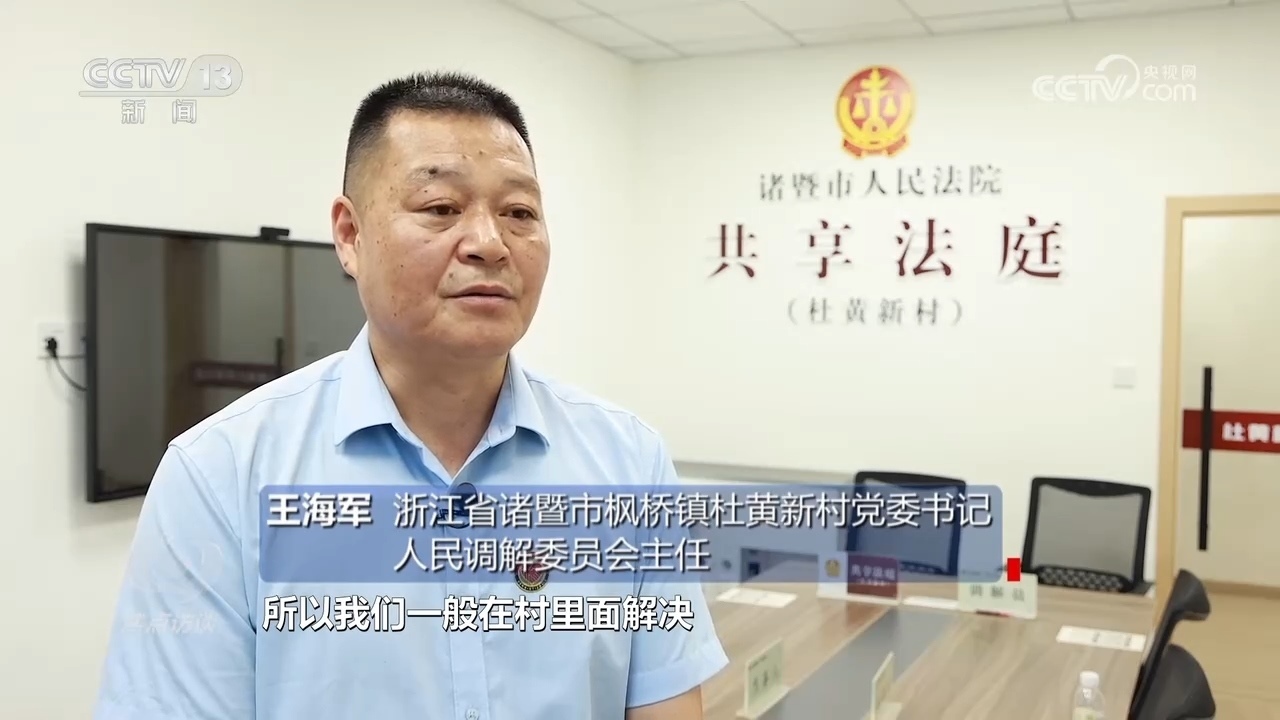 浙江省諸暨市楓橋鎮(zhèn)杜黃新村黨委書(shū)記、人民調(diào)解委員會(huì)主任王海軍:“村里一般的調(diào)解村兩委會(huì)以及村調(diào)委基本上就地解決,因?yàn)椤畻鳂蚪?jīng)驗(yàn)’矛盾不出村,所以我們一般在村里面解決。但是涉及到法律法規(guī)一塊或者有些老百姓在‘心結(jié)’上面解不開(kāi),我們就動(dòng)用共享法庭?!?/p>
