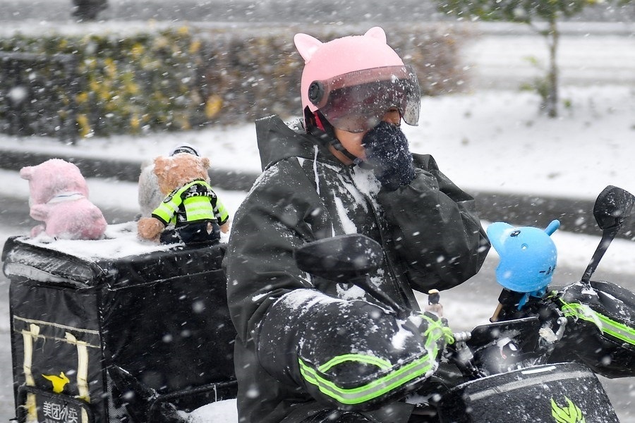11月6日,外賣員在長春市延安大街上冒雪配送外賣。新華社記者 顏麟蘊 攝