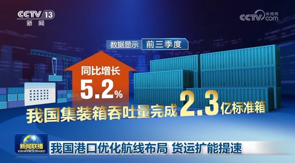 數(shù)據(jù)顯示,前三季度我國集裝箱吞吐量完成2.3億標(biāo)準(zhǔn)箱,同比增長5.2%。其中第三季度增長5.9%,增速較上半年加快1個百分點。