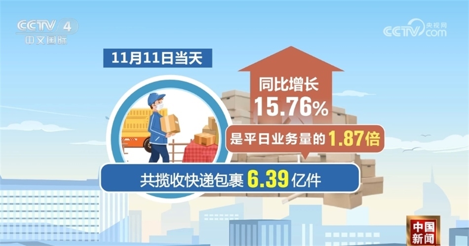 數(shù)據(jù)顯示,11月1日至11日,全國(guó)郵政快遞企業(yè)共攬收快遞包裹52.64億件,同比增長(zhǎng)23.22%,日均業(yè)務(wù)量是平日業(yè)務(wù)量的1.4倍。其中11月11日當(dāng)天,共攬收快遞包裹6.39億件,是平日業(yè)務(wù)量的1.87倍,同比增長(zhǎng)15.76%。