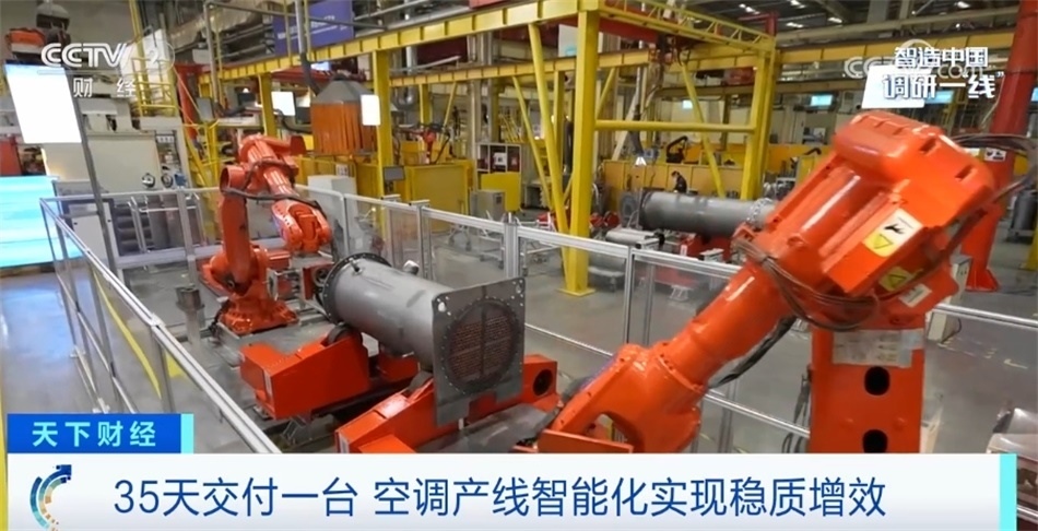 可以看到我身邊這條過道旁擺滿了產(chǎn)品,目前這家工廠所生產(chǎn)的中央空調(diào)處于訂單爆滿的狀態(tài)。生產(chǎn)一臺中央空調(diào)所需要的工序能夠達(dá)到上百道,目前這座“燈塔工廠”目前能夠做到最快35天交付產(chǎn)品,這與超級產(chǎn)線背后的智能化改造密不可分。空調(diào)主機(jī)下方的大型腔體,它內(nèi)部最多將安裝上千根換熱銅管,這些銅管與腔體之間沒有任何的焊接或黏合,是完全通過膨脹變形來完成固定與密封。這就意味著銅管安裝的好壞直接決定了這臺主機(jī)會不會泄漏制冷劑。目前這道工序已經(jīng)交由機(jī)械臂來完成,不僅安裝的時間由原來人工的兩個小時縮短至四十五分鐘,而且通過人工智能視覺檢測技術(shù),保障空調(diào)主機(jī)零泄漏。