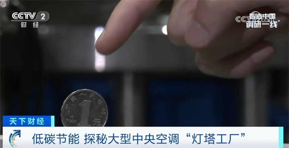 我現(xiàn)在走進(jìn)的這個區(qū)域是空調(diào)產(chǎn)線的末端——檢測平臺。每一臺空調(diào)出廠前都要在這里經(jīng)過全方位的檢測。眼前這就是一臺正在運(yùn)轉(zhuǎn)的氣懸浮中央空調(diào),我們在空調(diào)上立了一枚硬幣,可以看到是紋絲不動的,這也是氣懸浮的特點(diǎn)之一——運(yùn)行比較平穩(wěn)。在這塊屏幕上顯示著空調(diào)的出水溫度7℃,恒定的出水溫度讓這臺空調(diào)產(chǎn)生的冷風(fēng)非常柔和。目前,這座工廠全流程的自動化生產(chǎn)能夠滿足從小型商用空調(diào)生產(chǎn)到用戶需求的大規(guī)模定制。目前低能耗、智能化產(chǎn)品已應(yīng)用在商業(yè)地產(chǎn)、酒店、軌道交通等各種場景,極大程度助力著國家“雙碳”政策以及各大行業(yè)的低碳轉(zhuǎn)型。