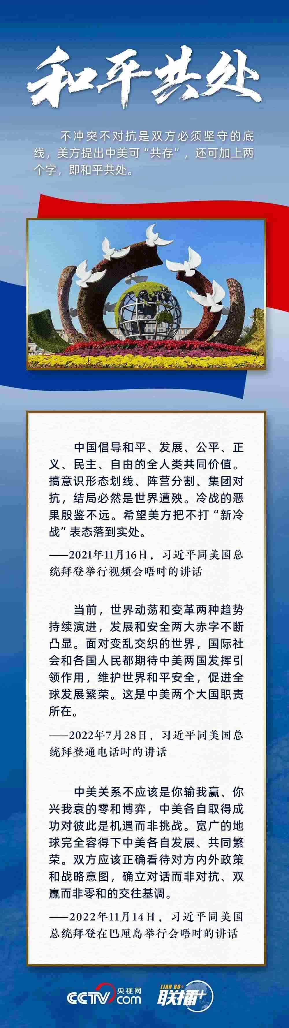 “中美不沖突、不對(duì)抗、和平共處,這是兩國(guó)最基本的共同利益。”習(xí)主席指出,遵守國(guó)際關(guān)系基本準(zhǔn)則和中美三個(gè)聯(lián)合公報(bào),這是雙方管控矛盾分歧、防止對(duì)抗沖突的關(guān)鍵,也是中美關(guān)系最重要的防護(hù)和安全網(wǎng)。