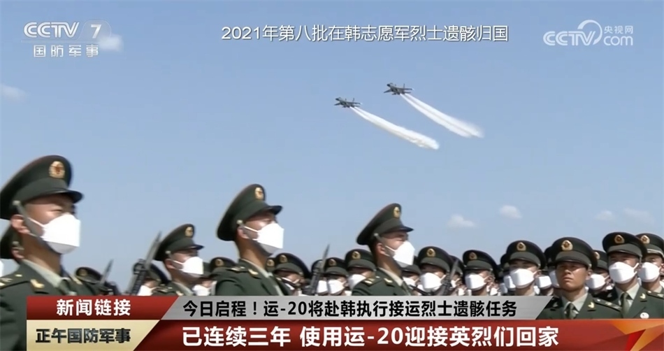 今年是中國人民志愿軍抗美援朝出國作戰(zhàn)勝利70周年。在偉大的抗美援朝戰(zhàn)爭中,197000多名中國人民志愿軍光榮犧牲。黨和國家高度重視在韓志愿軍烈士遺骸歸國安葬工作,2014年以來,中韓雙方遵循人道主義精神,已成功交接913位在韓志愿軍烈士遺骸。今年也是按照中韓雙方達(dá)成共識的第十次交接。值得一提的是,十次交接,中國空軍都執(zhí)行為專機護(hù)航的任務(wù)。從2020年起,我國已經(jīng)連續(xù)三年使用運-20接迎英烈回家,今年是第四年。而從去年開始,更是“雙20”列陣長空,告慰英烈。