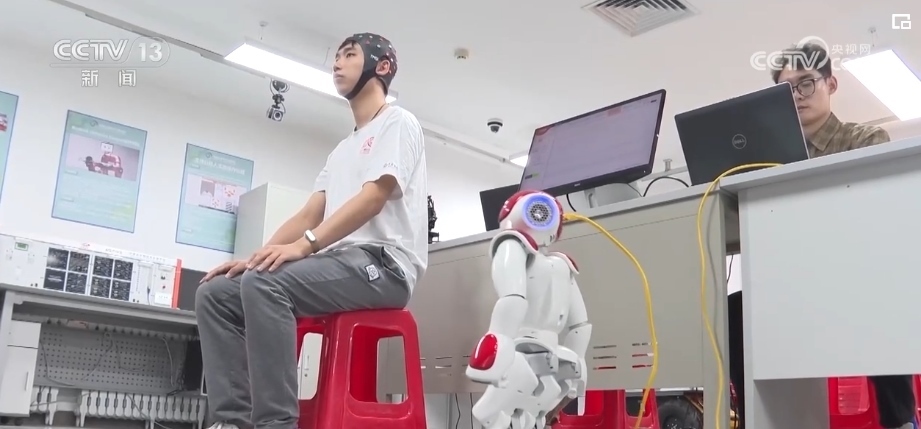 記者來到這間研發(fā)人形機(jī)器人的實驗室時,科研團(tuán)隊正在測試機(jī)器人的同步能力。眼前的機(jī)器人不僅可以通過攝像頭,捕捉人們的動作后進(jìn)行同步模仿,還可以通過腦機(jī)接口、肌電交互等方式,捕捉人們的腦電信息和運動意圖,直接同步控制機(jī)器人的行為。