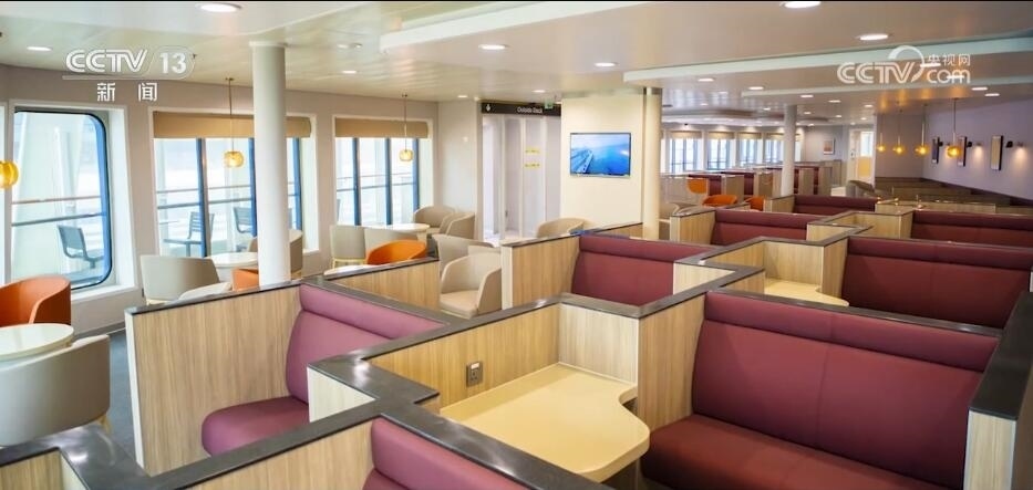 中國(guó)船舶廣船國(guó)際客滾船大項(xiàng)目經(jīng)理 李會(huì)倫:這艘船采用雙頭設(shè)計(jì),進(jìn)出港不用調(diào)頭,船員可分別在兩個(gè)駕駛室駕駛這艘船,因此可以節(jié)省大量進(jìn)出港時(shí)間。船上共配備了1160塊大容量電池,電池裝船容量達(dá)到8.8兆瓦時(shí),相當(dāng)于150輛電動(dòng)汽車(chē)的電池容量之和,可在近海航行時(shí)采用全電力推進(jìn),實(shí)現(xiàn)零排放。