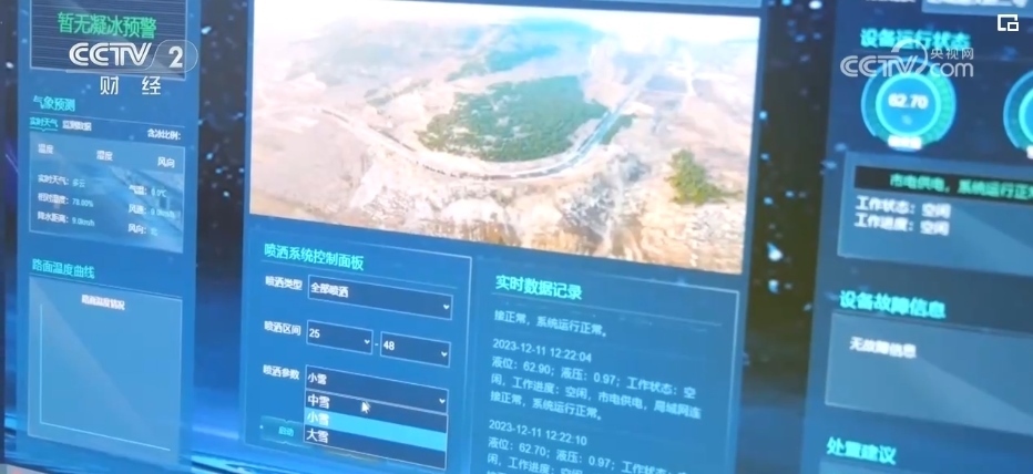 12月11日上午,記者看到肥城市交通部門工作人員,在監(jiān)控中心,遠(yuǎn)程啟動了路面融冰融雪系統(tǒng)。在儀汶公路棋石嶺“S”形路段出,路邊噴頭噴灑環(huán)保型融雪劑快速融化路面的冰雪。