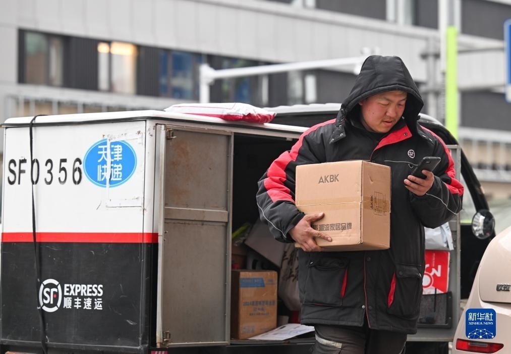 12月12日,在天津市南開(kāi)區(qū)水上公園街道,快遞員在派送郵件。