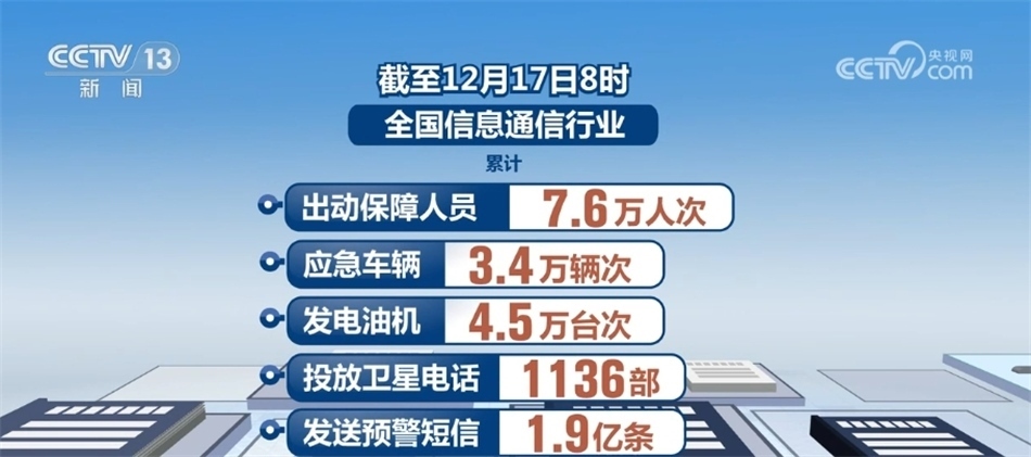 據(jù)了解,截至12月17日8時,全國信息通信行業(yè)累計出動保障人員7.6萬人次、應(yīng)急車輛3.4萬輛次、發(fā)電油機4.5萬臺次、投放衛(wèi)星電話1136部、發(fā)送預(yù)警短信1.9億條。全國通信網(wǎng)絡(luò)整體運行平穩(wěn),累計3053座基站退服,已修復(fù)2933座,未發(fā)生鄉(xiāng)鎮(zhèn)級通信全阻。