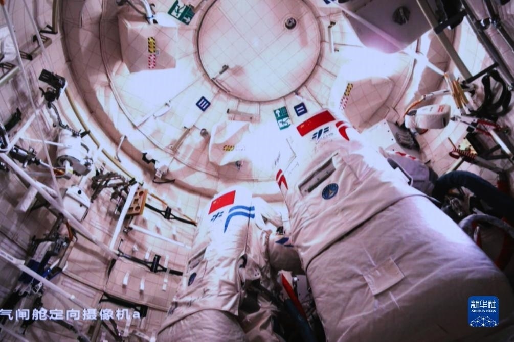 12月21日在北京航天飛行控制中心拍攝的神舟十七號航天員湯洪波(右)、唐勝杰返回問天實驗艙并關(guān)閉艙門的畫面。新華社發(fā)(韓啟揚攝)