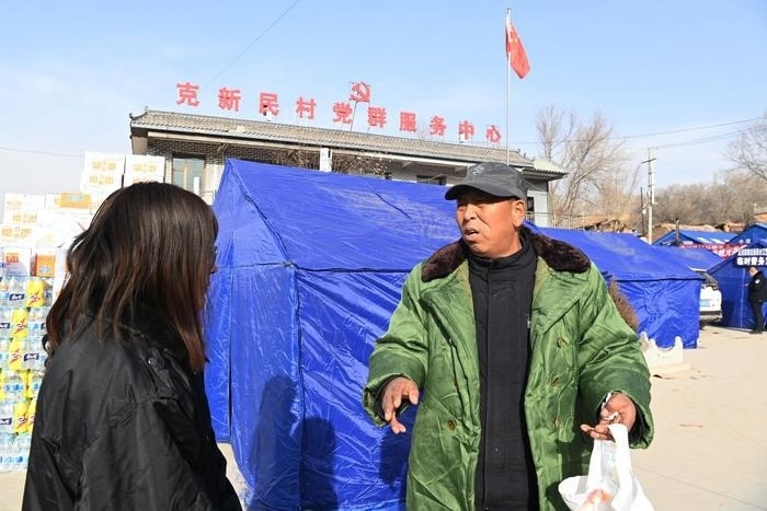 2023年12月22日,在積石山縣大河家鎮(zhèn)克新民村安置點,黨支部書記張輝林(右)給工作人員囑咐物資分發(fā)事項。新華社記者 范培珅 攝
