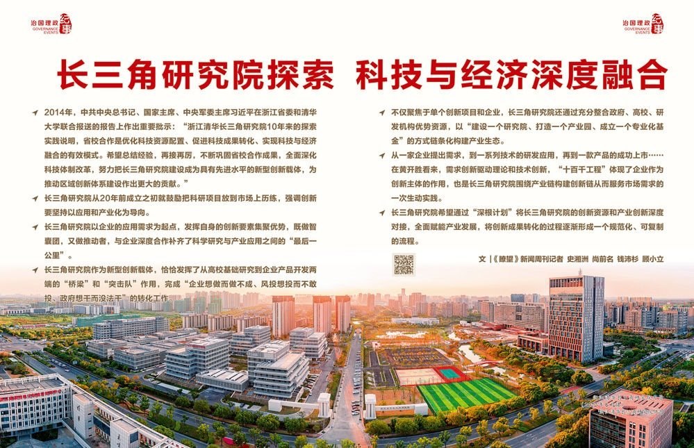 2014年,中共中央總書(shū)記、國(guó)家主席、中央軍委主席習(xí)近平在浙江省委和清華大學(xué)聯(lián)合報(bào)送的報(bào)告上作出重要批示:“浙江清華長(zhǎng)三角研究院10年來(lái)的探索實(shí)踐說(shuō)明,省校合作是優(yōu)化科技資源配置、促進(jìn)科技成果轉(zhuǎn)化、實(shí)現(xiàn)科技與經(jīng)濟(jì)融合的有效模式。希望總結(jié)經(jīng)驗(yàn),再接再厲,不斷鞏固省校合作成果,全面深化科技體制改革,努力把長(zhǎng)三角研究院建設(shè)成為具有先進(jìn)水平的新型創(chuàng)新載體,為推動(dòng)區(qū)域創(chuàng)新體系建設(shè)作出更大的貢獻(xiàn)?!?/p>
