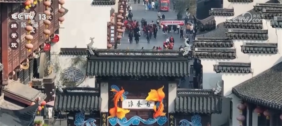 ??????新年將至,南京秦淮河畔的各式花燈陸續(xù)落成,與古建筑相互映襯。碧水繞城,畫舫穿行,裝扮后的古城如畫如詩(shī)。在“古秦淮”的牌坊上,魚躍龍門的造型立體生動(dòng)。人們穿過(guò)牌坊,采買年貨,拍照留念。在夫子廟南側(cè)的門東歷史文化街區(qū),一條大龍?jiān)煨偷幕粢莱菈Χ?。十二生肖燈組活靈活現(xiàn),讓古樸的街巷增添了迎新的色彩。