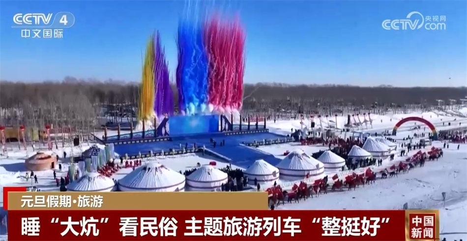 總臺(tái)央視記者 楊曜語:我即將登上的列車就是從哈爾濱開往漠河的國(guó)內(nèi)首個(gè)沉浸式東北民俗文化體驗(yàn)列車,坐過的人都說一上車就想盤腿兒了,我們趕緊來體驗(yàn)一下!一上車我就被濃濃的東北文化所感染到了,整個(gè)車廂都被東北大花的經(jīng)典配色裝飾著,再加上隨手就能品嘗到東北特色美食,坐在床鋪上就感覺一秒鐘“穿越”到農(nóng)家炕頭。