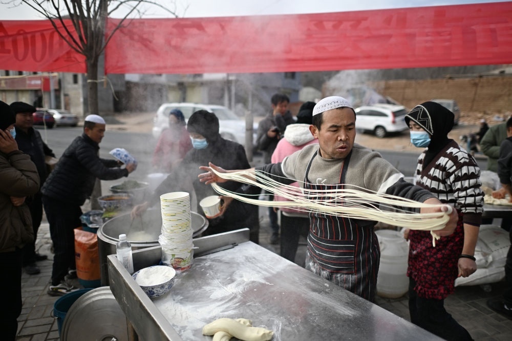 在青海省海東市民和縣官亭鎮(zhèn),一家拉面店店主不顧自家在地震中受損的店鋪,支起鍋灶為鄉(xiāng)親們免費(fèi)提供拉面。這是店員和附近幫忙的村民在拉面攤上忙碌(12月20日攝)。新華社記者 張宏祥 攝