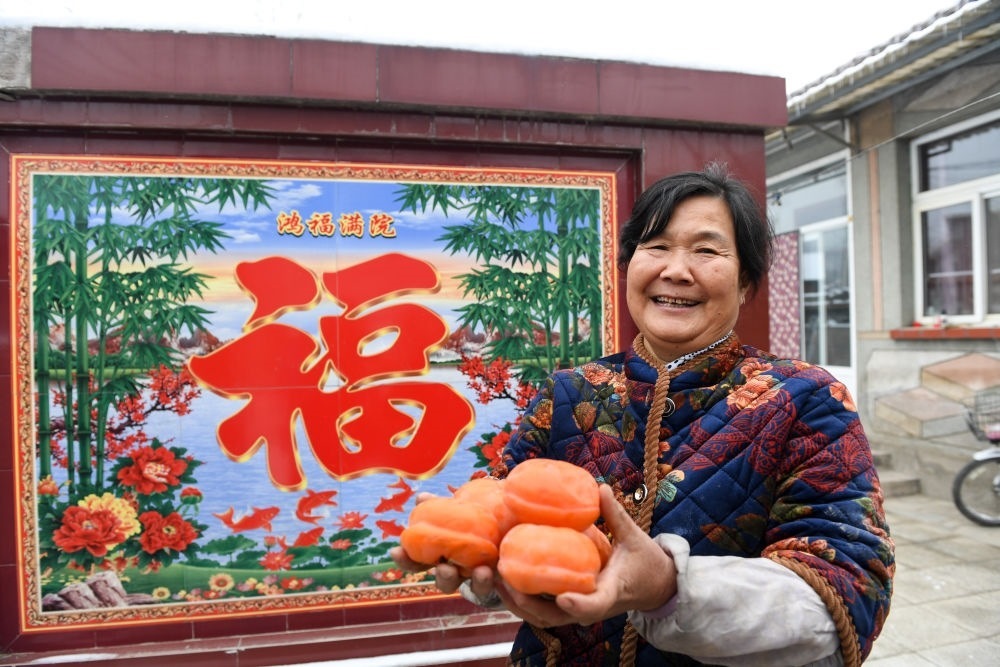 在北京市房山區(qū)佛子莊鄉(xiāng)陳家臺(tái)村,61歲的村民馬書(shū)金在修繕完畢的院子里展示不久前在山上摘得的柿子(12月12日攝)。新華社記者 鞠煥宗 攝