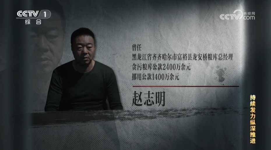 【解說詞】趙志明曾是黑龍江省齊齊哈爾市富??h龍安橋糧庫總經(jīng)理,經(jīng)查,他貪污糧庫公款2400萬余元,挪用公款1400萬余元,2023年3月被判處有期徒刑14年。龍安橋糧庫是在2015年由5家國有糧庫改革重組的,富??h政府持股51%、民營企業(yè)鼎倉公司持股49%。趙志明原本是鼎倉公司的老板,在這次改制中當上了龍安橋糧庫總經(jīng)理。