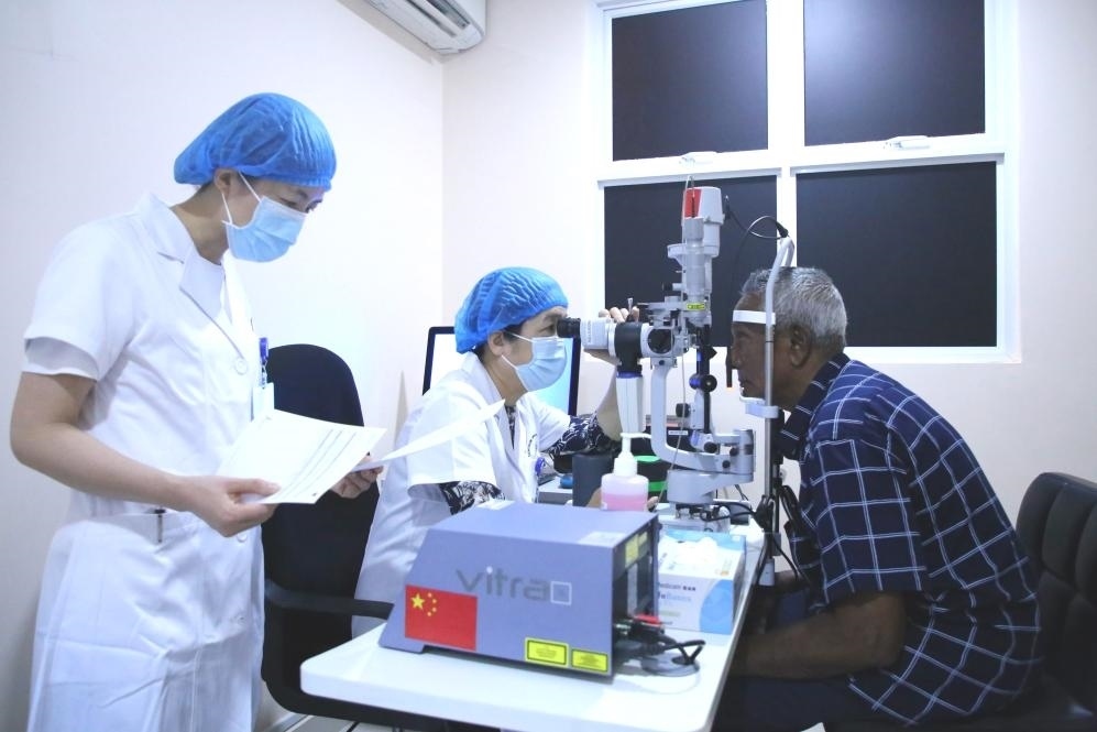2023年2月4日,在馬爾代夫首都馬累附近的胡魯馬累醫(yī)院,中國(guó)-馬爾代夫眼科中心中方專家為當(dāng)?shù)鼗颊咦鲅劭茩z查。