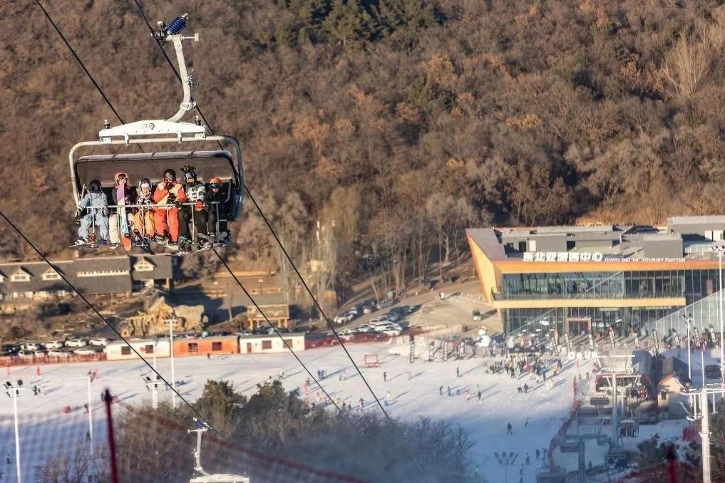 圖為游客在東北亞國(guó)際滑雪場(chǎng)乘坐纜車。