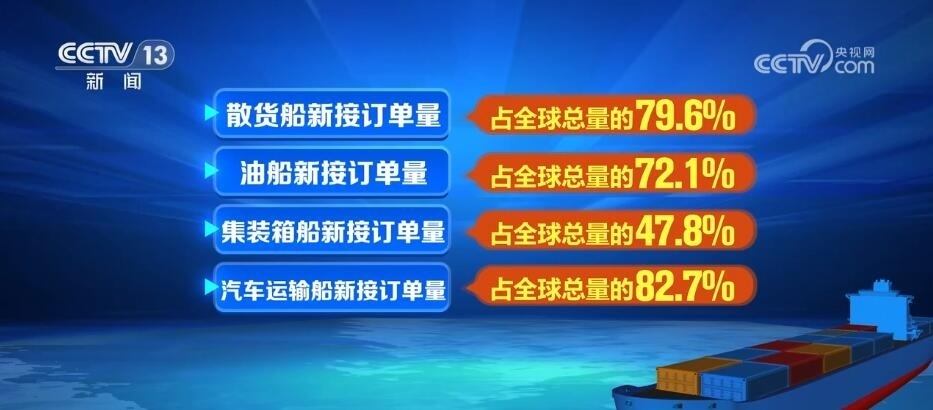 2023年全年數(shù)據(jù)顯示,全球18種主要船型中,我國(guó)有14種船型新接訂單位列全球第一,其中,散貨船、油船、集裝箱船和汽車運(yùn)輸船新接訂單量分別占全球總量的79.6%、72.1%、47.8%和82.7%。