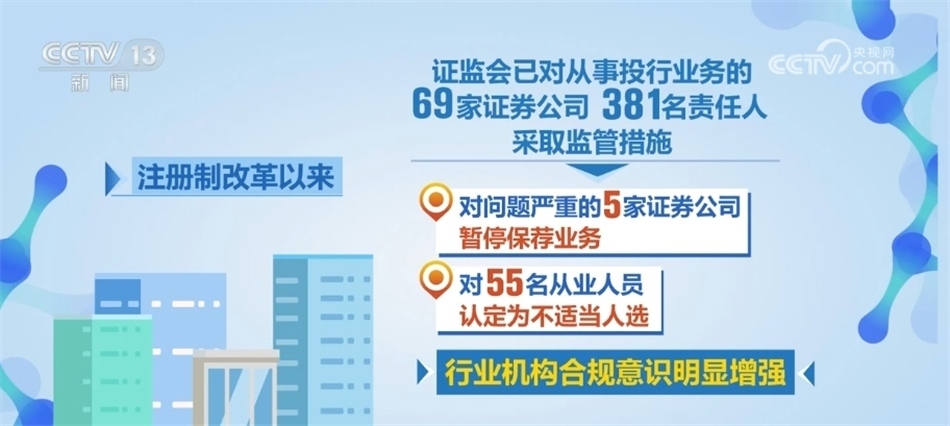 數(shù)據(jù)顯示,注冊制改革以來,證監(jiān)會已對從事投行業(yè)務(wù)的69家證券公司、381名責任人采取了監(jiān)管措施,特別是對問題嚴重的5家證券公司暫停保薦業(yè)務(wù),對55名從業(yè)人員認定為不適當人選,行業(yè)機構(gòu)合規(guī)意識明顯增強。